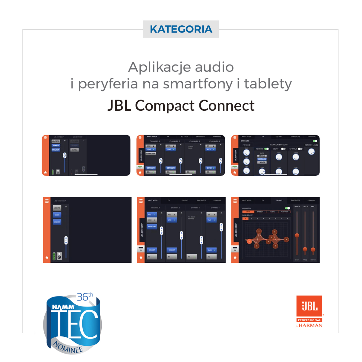 Aplikacja JBL Compact Connect jest dedykowana do zestawu głośnikowego JBL EON ONE, który jest wyposażony w funkcję zdalnej kontroli za pomocą Bluetooth. Pozwala na szybkie i komfortowe ustawienia wszystkich funkcji i parametrów jakie są niezbędne do pracy. Za jej pomocą można sterować czterema kolumnami jednocześnie!