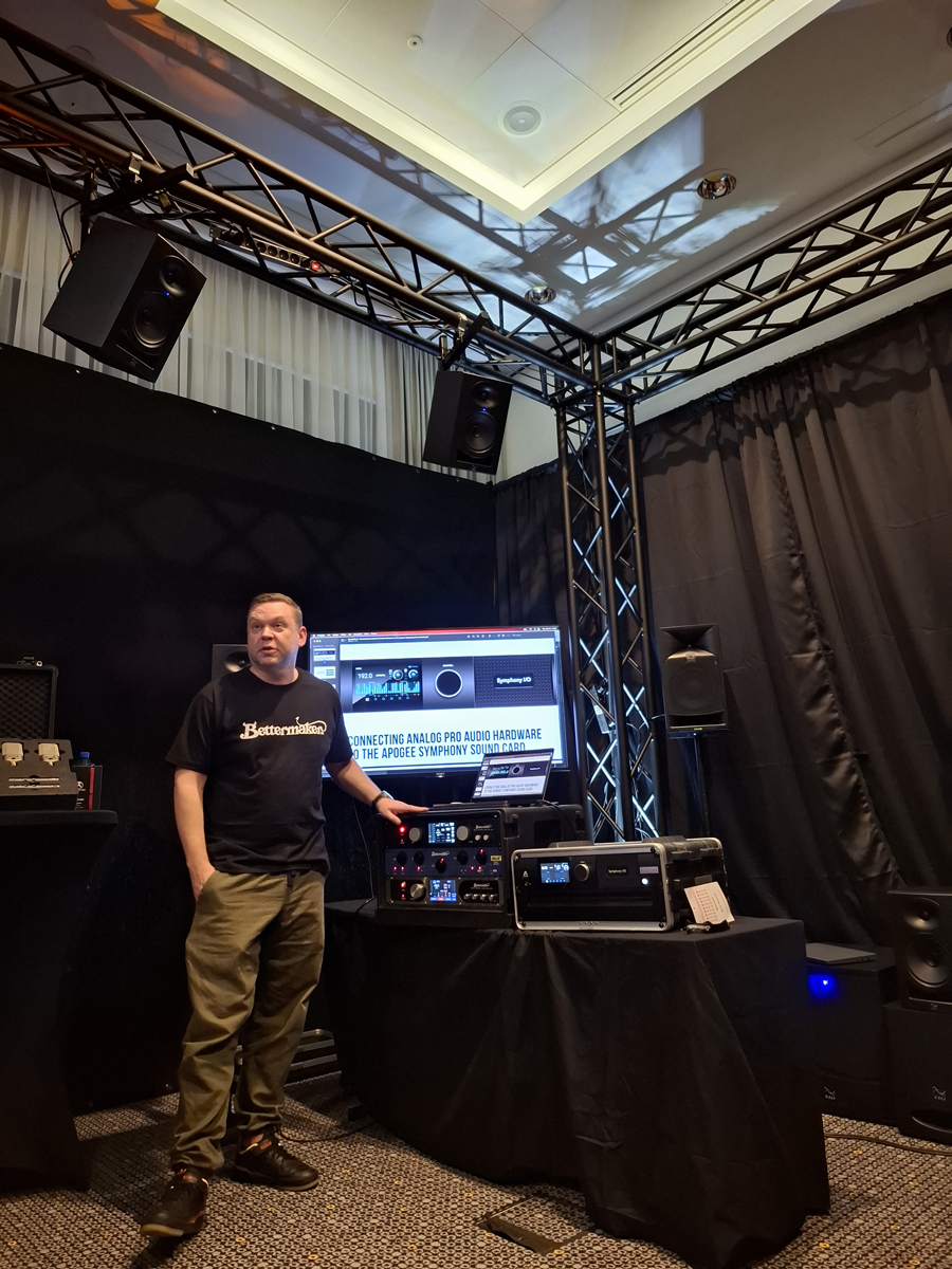 Na naszym stoisku pojawił się również Marek Walaszek z Bettermaker / Addicted to Music, który dołączył do prezentacji, wprowadzając uczestników w tajniki zarządzania pracą w studiu hybrydowym. W trakcie warsztatów Marek opowiadał o integracji analogowych procesorów audio z wielokanałowymi interfejsami, takimi jak karty dźwiękowe Apogee, co pozwala na połączenie analogowego i cyfrowego brzmienia w jednym projekcie. Dzięki jego praktycznym poradom uczestnicy mieli szansę dowiedzieć się, jak uporządkować swoje studio i zoptymalizować workflow, aby efektywnie wykorzystać sprzęt. Marek Walaszek to postać dobrze znana w branży, a jego wskazówki były bezcenne dla uczestników.