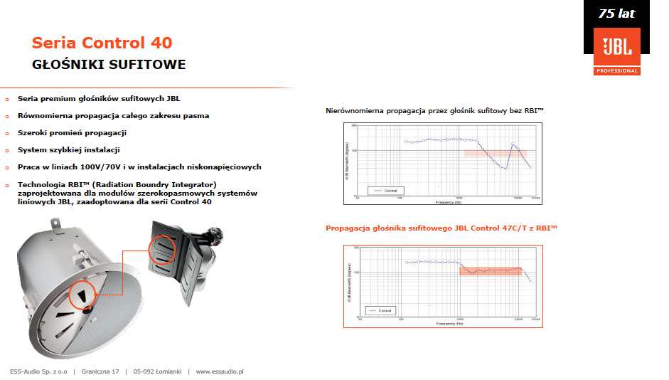 - Technologia RBI™ (Radiation Boundry Integrator) zaprojektowana dla modułów szerokopasmowych systemów liniowych JBL, zaadoptowana dla serii Control 40