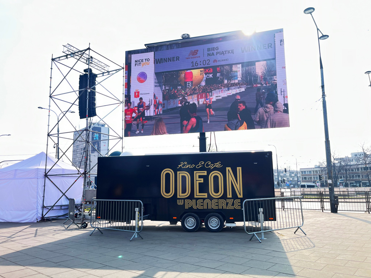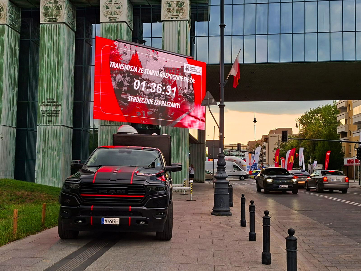 Ale na tym nie koniec. Kolejnym krokiem była inwestycja w mobilny ekran LED o powierzchni 21 m², z możliwością obracania o 360 stopni zapewniając doskonałą widoczność z każdego miejsca, zainstalowany w przyczepie gwarantującej ustawienie w dowolnej lokalizacji. Przyczepa z ekranem wyposażona jest w system precyzyjnego manewrowania pojazdem przy pomocy pilota zdalnego sterowania.